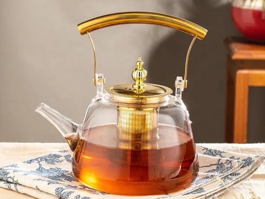 Théière en verre avec passoire dorée et poignée latérale en bois LM32-7